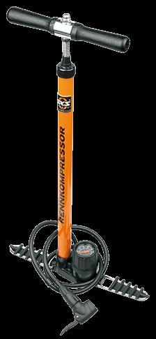 El RENNKOMPRESSOR ha sido la bomba más popular en el ciclismo internacional durante más de 50 años y el único antepasado legítimo de todas las bombas de soporte para bicicletas. El tubo de metal sólido, la base de hierro fundido, el manómetro de precisión y el mango de madera negra son prueba de la mejor calidad "made in Germany". Los pies se pliegan para facilitar su transporte.