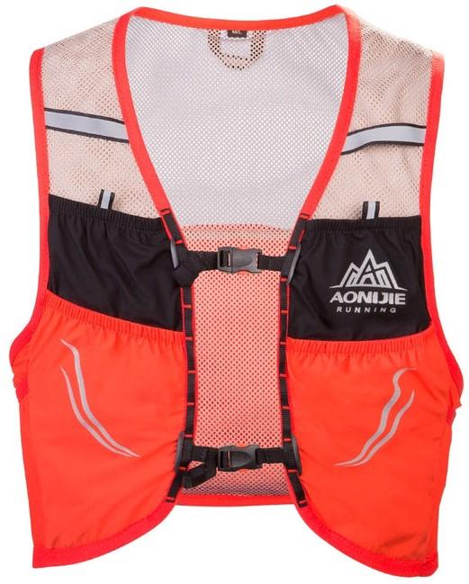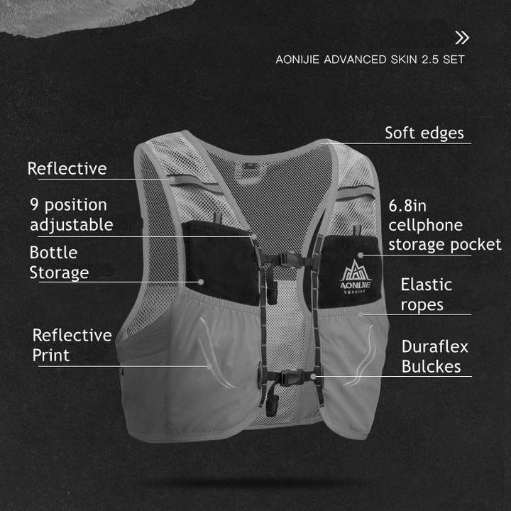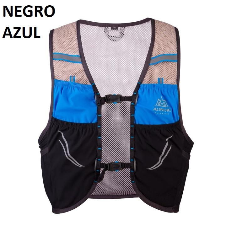 Dos bolsillos delanteros de malla expandible con capacidad para dos soft flask de 500ml, y goma elastica con tirador reflectante para sujerar el soft flask doblemente, cierre bolsillo elástico y goma elástica