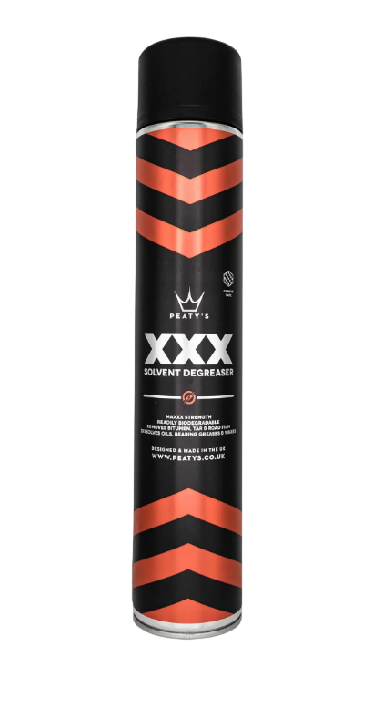 PEATY'S XXX SOLVENT DEGREASER es un desengrasante y desengrasante solvente, soluble en agua, fácilmente biodegradable y de fuerza máxima, diseñado para la eliminación completa de grasas, ceras, aceites y manchas de betún y alquitrán de rodamientos. Para usar en superficies metálicas, pero también es seguro para usar en fibra de carbono y muchos otros plásticos y superficies pintadas.