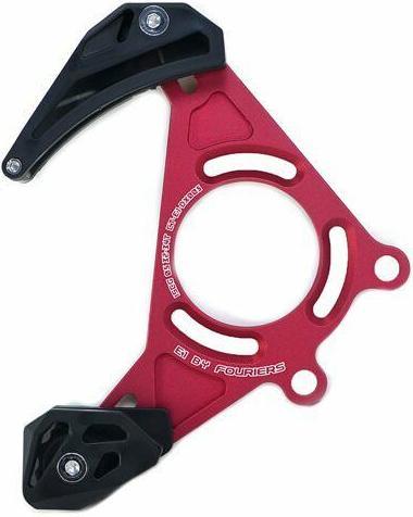 Incluye guía superior, guía inferior y protector (bash guard) fabricados posiblemente en plástico reforzado o material endurecido para resistencia al impacto.
