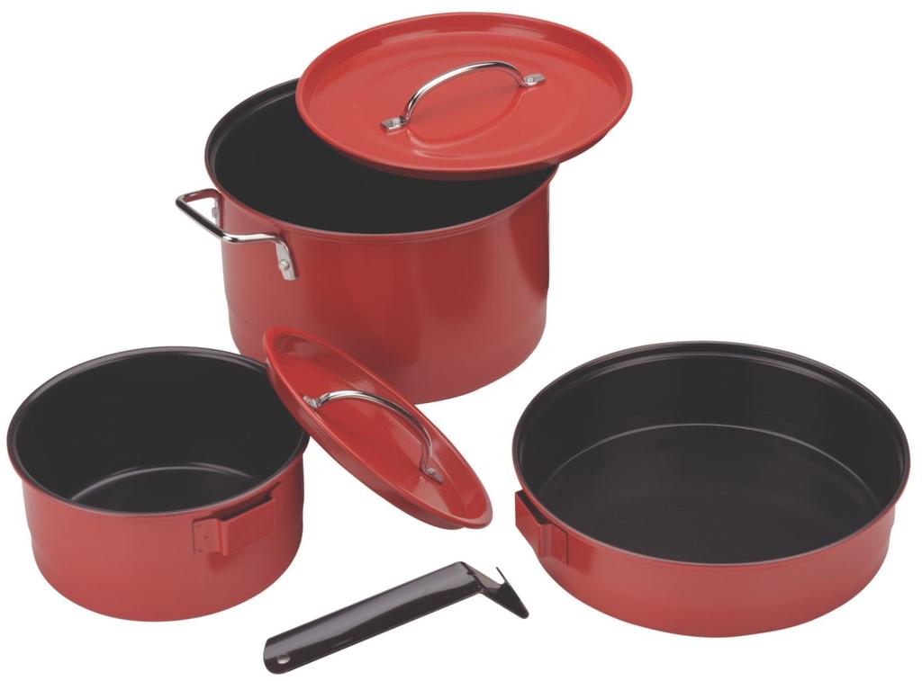 Características:                                                                                                                                                                       Este conjunto de acero rojo es tan duradero como elegante. Incluye un 10 en. (25.4 cm) sartén, 6.5-qt. Tetera, 2.5 qt. Cacerola con tapa y un asa desmontable. Con superficies antiadherentes para una fácil limpieza, una construcción resistente de calidad comercial y mangos remachados y enchapados, cocinarás con este juego por años. Perfecto para cocinar en interiores y exteriores.