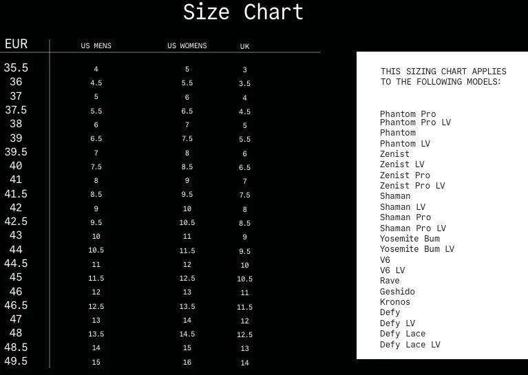 • Tallas: 5-14 EE. UU. HOMBRES (INCLUYENDO MEDIAS TALLAS), 6-15 EE. UU. MUJERES (INCLUYENDO MEDIAS TALLAS).